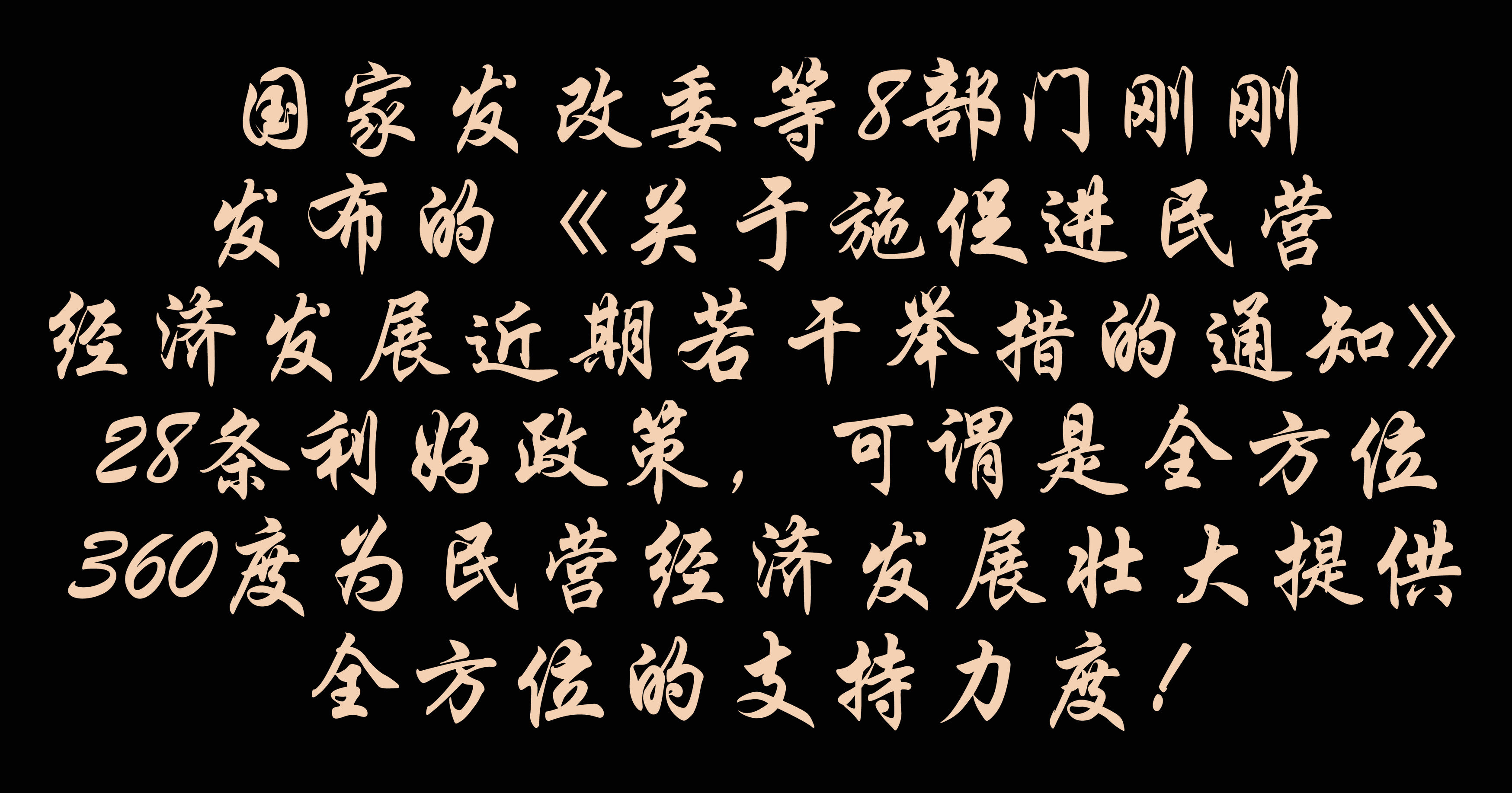 國家發(fā)改委等8部門剛剛發(fā)布的《關(guān)于實施促進民營經(jīng)濟發(fā)展近期若干舉措的通知》28條利好政策,可謂是全方位360度為民營經(jīng)濟發(fā)展壯大提供全方位支持的力度,對于民營企業(yè)來說可謂是千載難逢的機遇期,對于民營企業(yè)家來說可謂是定心丸和助跑器,把做大做強自己的企業(yè)作為一種使命和任務(wù),這才是對國家和民族義不容辭的責任的最好行動!