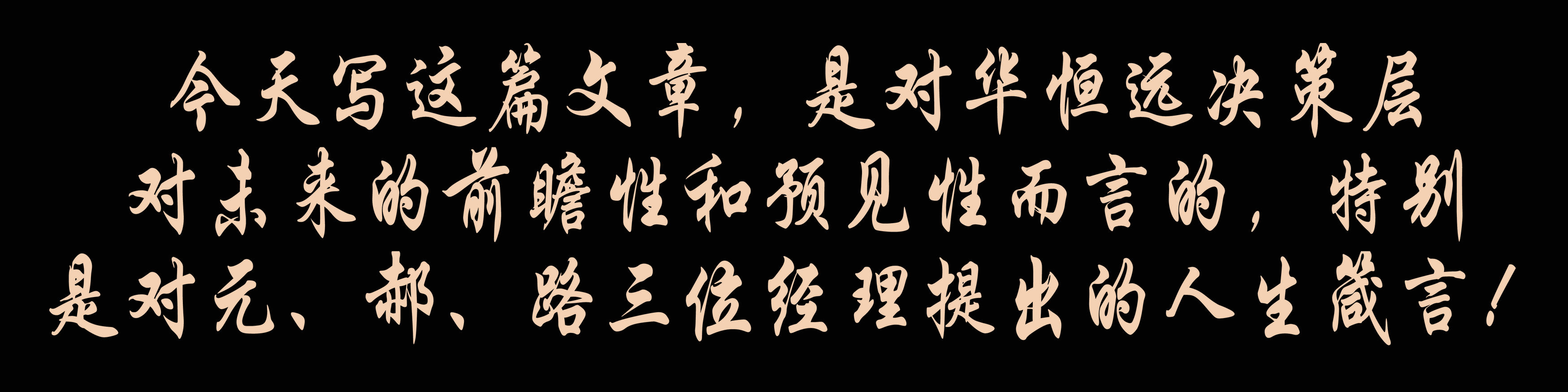 今天寫這篇文章,是對華恒遠決策層對未來的前瞻性和預見性而言的,特別是對元、郝、路三位經(jīng)理提出的人生箴言!