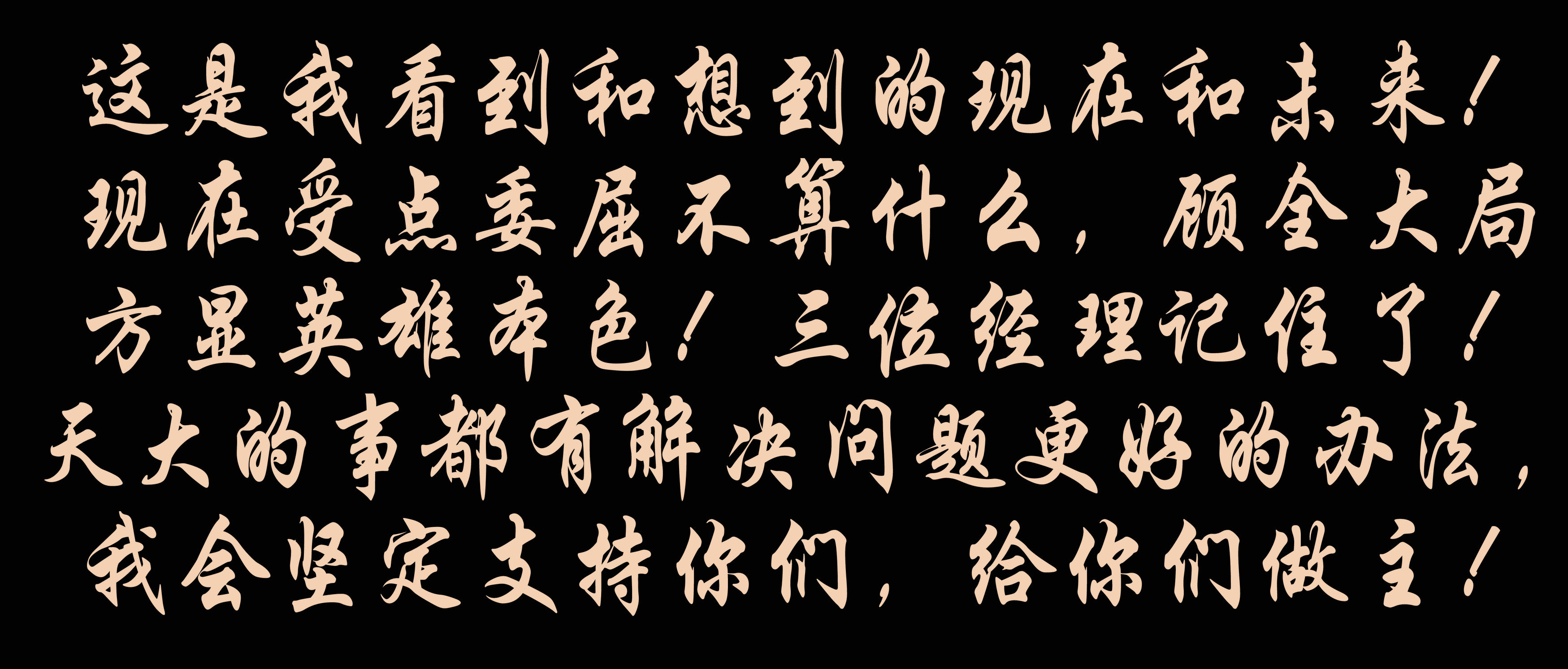 這是我看到和想到的現(xiàn)在和未來!現(xiàn)在受點(diǎn)委屈不算什么,顧全大局方顯英雄本色!三位經(jīng)理記住了!
