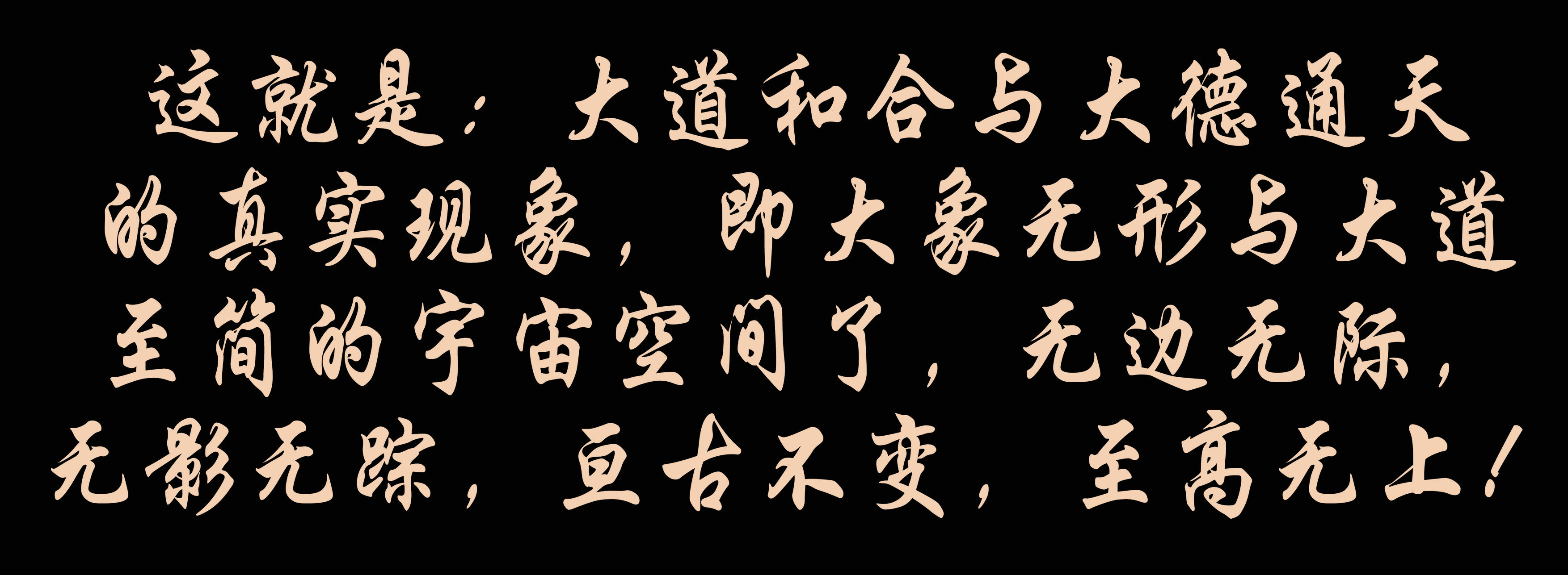 這就是:大道和合與大德通天的真實(shí)現(xiàn)象,即大象無形與大道至簡的宇宙空間了,無邊無際,無影無蹤,亙古不變,至高無上!