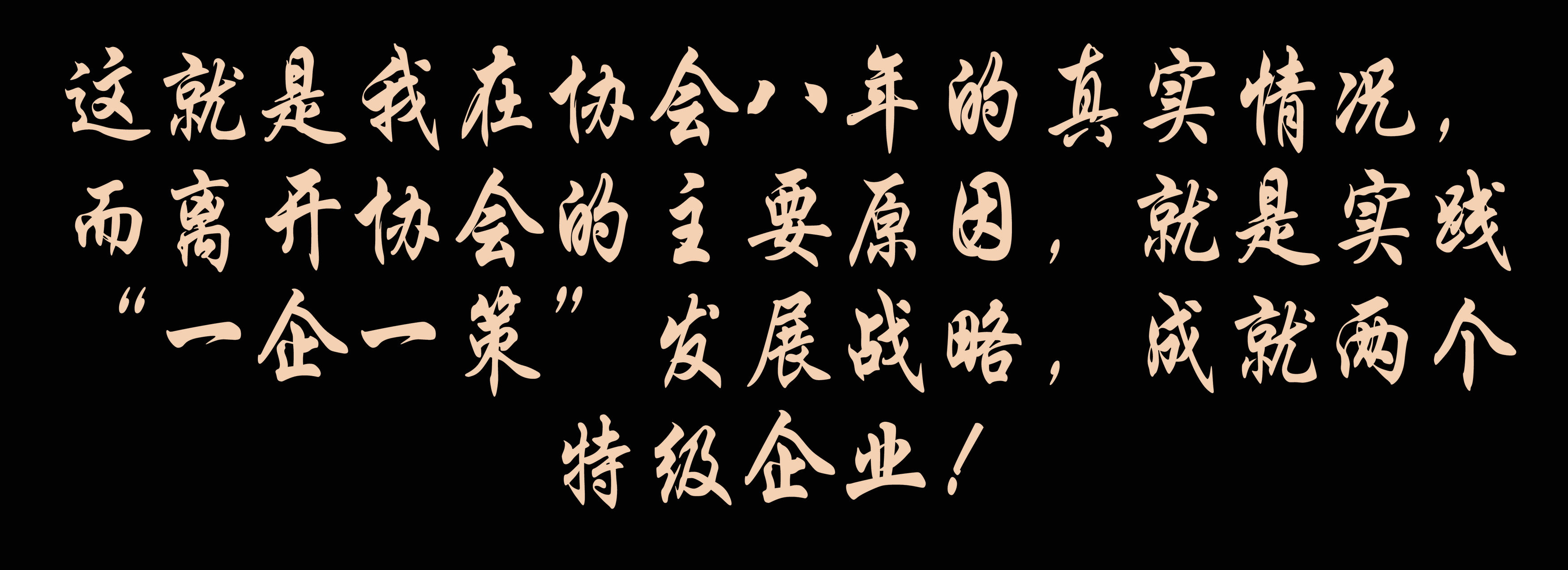 這就是我在協(xié)會八年的真實情況,而離開協(xié)會的主要原因,就是實踐“一企一策”發(fā)展戰(zhàn)略,成就兩個特級企業(yè)!