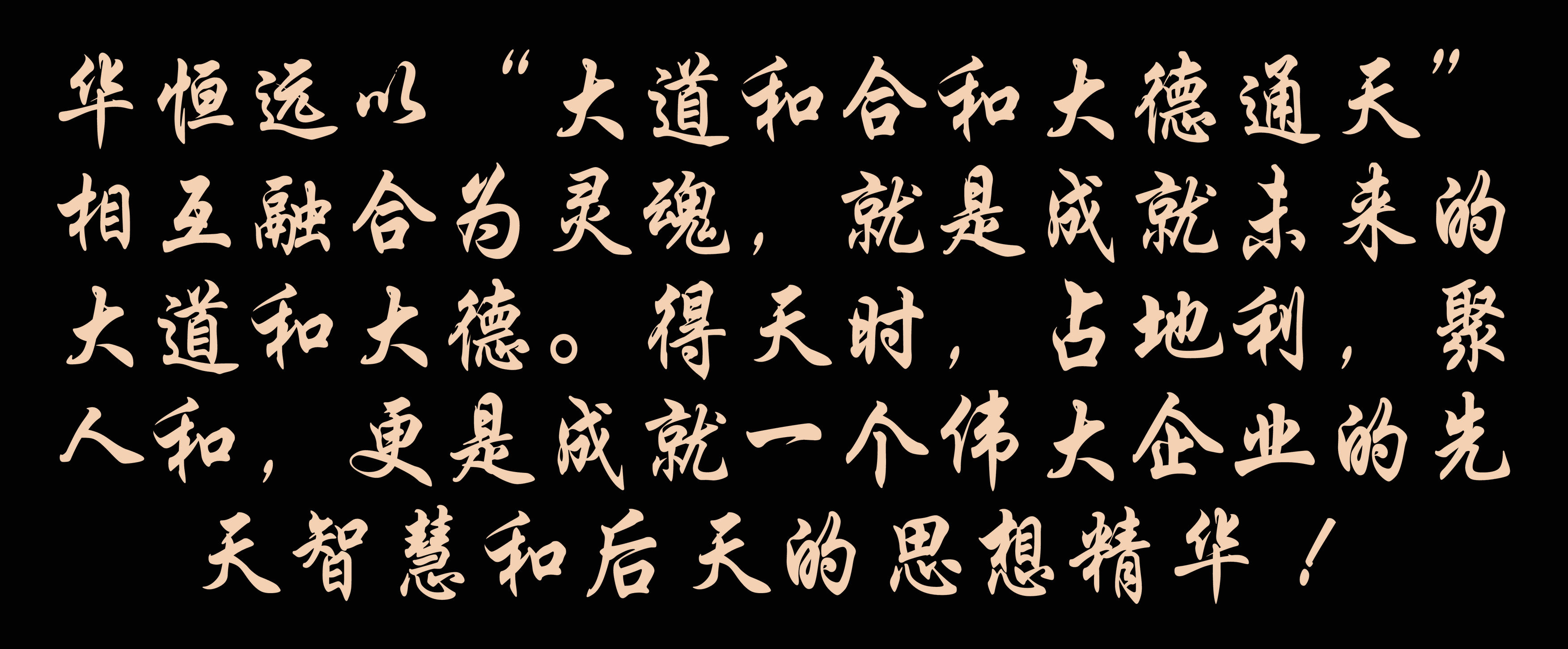 華恒遠(yuǎn)以“大道和合和大德通天”相互融合為靈魂,就是成就未來的大道和大德。得天時,占地利,聚人和,更是成就一個偉大企業(yè)的先天智慧和后天的思想精華 !