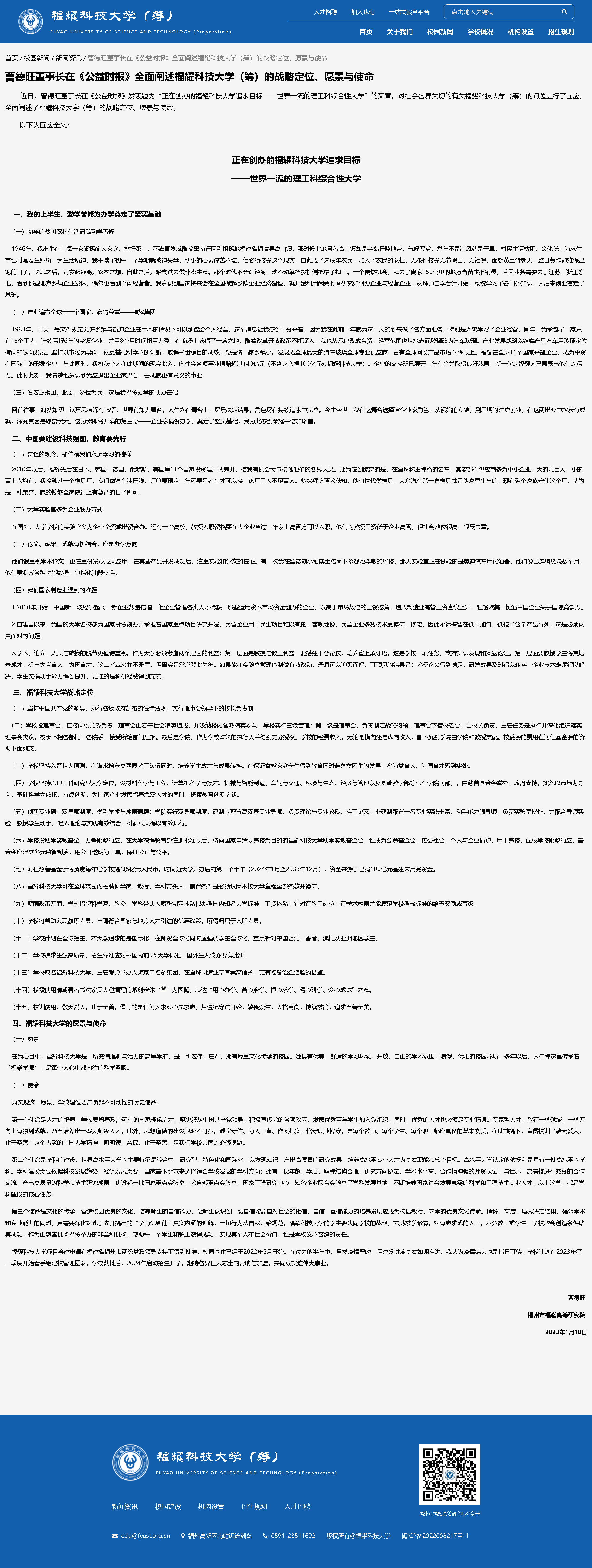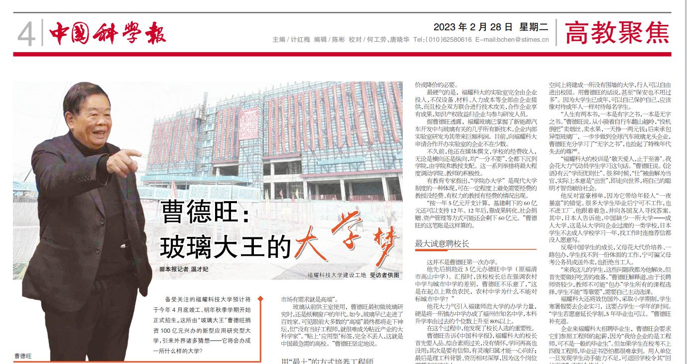 官網(wǎng)顯示,福耀科技大學(xué)(籌)是由福耀集團(tuán)董事局主席曹德旺所創(chuàng)辦的河仁慈善基金會(huì)首期捐資100億元人民幣,以民辦公助的形式與福州市人民政府合作創(chuàng)辦的一所新型應(yīng)用型、研究性大學(xué)。