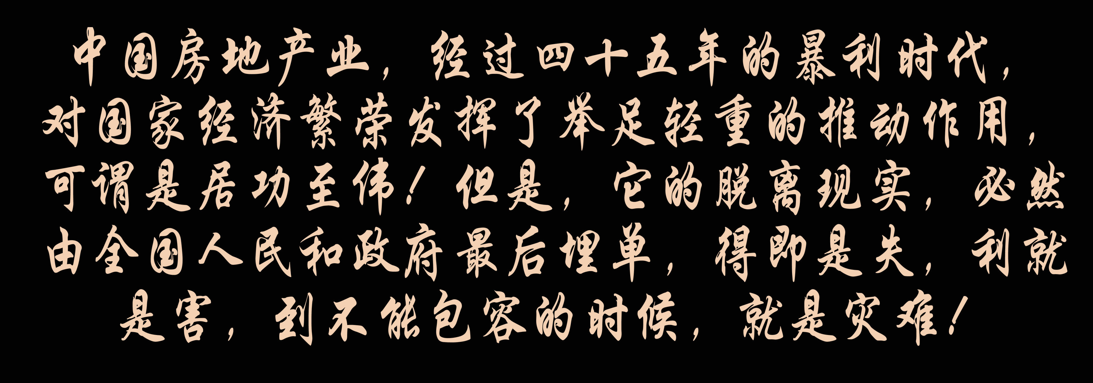 中國(guó)房地產(chǎn)業(yè),經(jīng)過(guò)四十五年的暴利時(shí)代,對(duì)國(guó)家經(jīng)濟(jì)繁榮發(fā)揮了舉足輕重的推動(dòng)作用,可謂是居功至偉!但是,它的脫離現(xiàn)實(shí),必然由全國(guó)人民和政府最后埋單,得即是失,利就是害,到不能包容的時(shí)候,就是災(zāi)難!