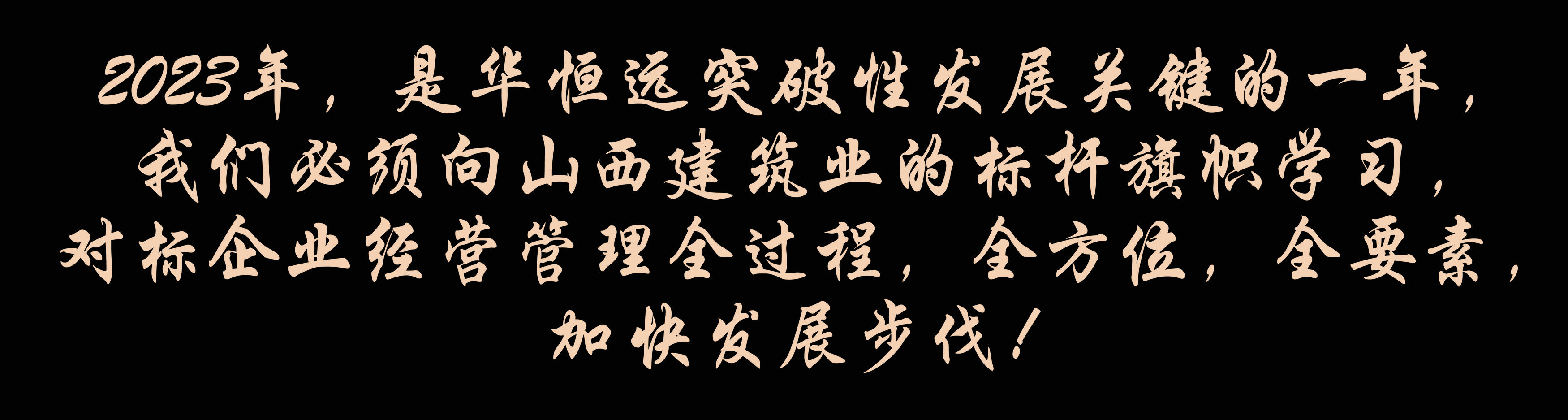 2023年,是華恒遠(yuǎn)突破性發(fā)展關(guān)鍵的一年,我們必須向山西建筑業(yè)的標(biāo)桿旗幟學(xué)習(xí),對(duì)標(biāo)企業(yè)經(jīng)營(yíng)管理全過程,全方位,全要素,加快發(fā)展步伐!