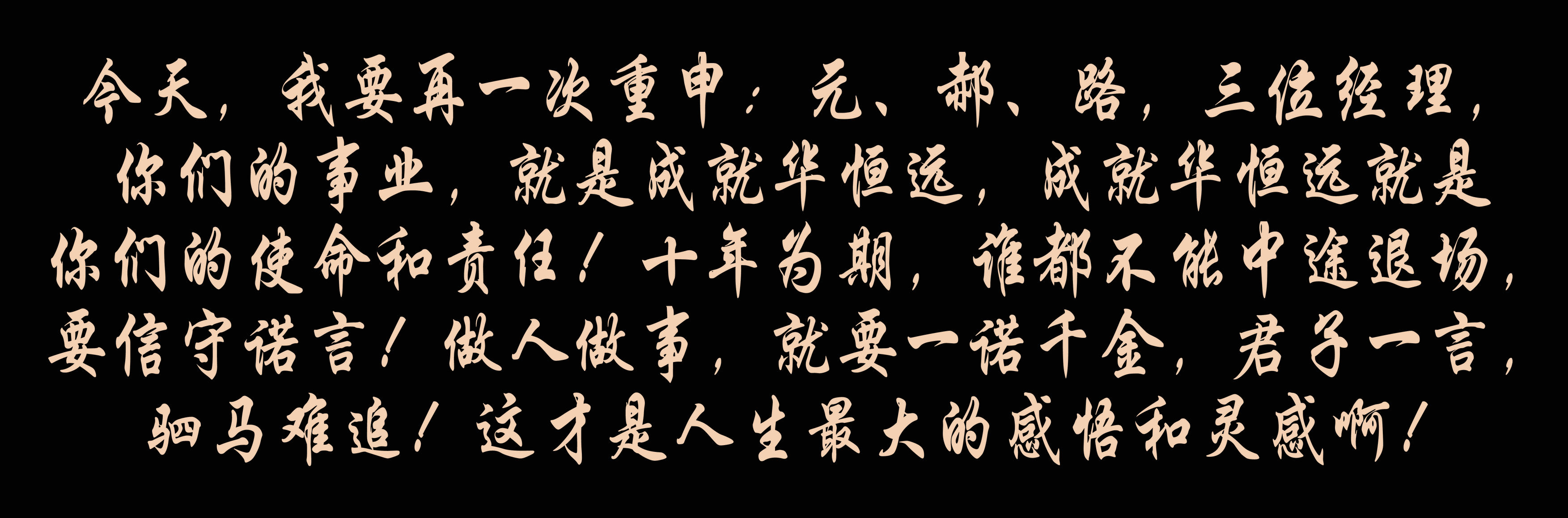 今天,我要再一次重申:元、郝、路,三位經(jīng)理,你們的事業(yè),就是成就華恒遠(yuǎn),成就華恒遠(yuǎn)就是你們的使命和責(zé)任!十年為期,誰(shuí)都不能中途退場(chǎng),要信守諾言!做人做事,就要一諾千金,君子一言,駟馬難追!