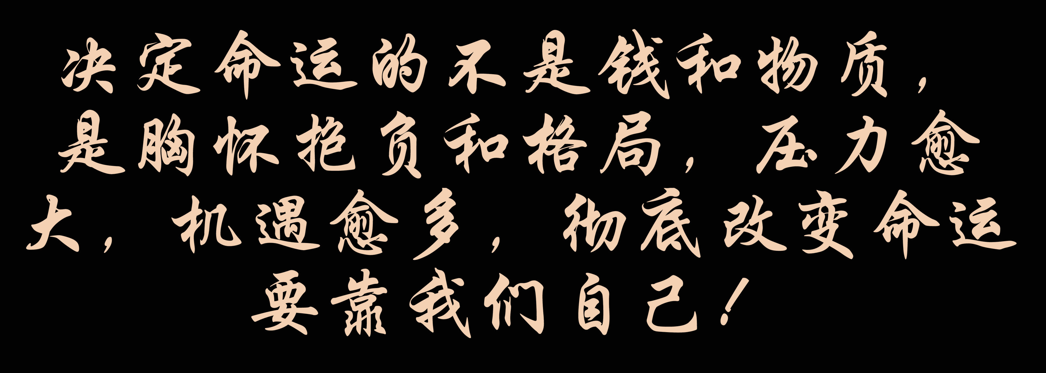 苦難是成就一切最大的天機(jī),華恒遠(yuǎn)需要一次改變命運(yùn)的機(jī)遇!這正是我謀略未來(lái)最大的底氣,決定命運(yùn)的不是錢(qián)和物質(zhì),是胸懷抱負(fù)和格局,壓力愈大,機(jī)遇愈多,徹底改變命運(yùn)要靠我們自己!