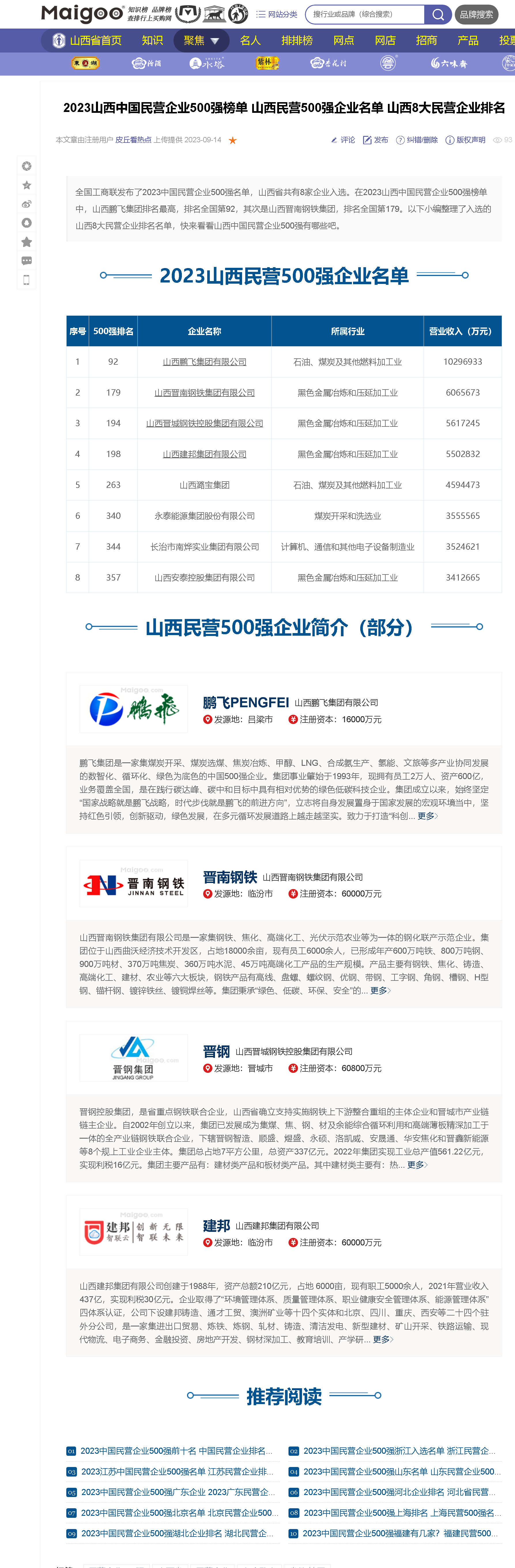 山西省上榜中國(guó)民營(yíng)企業(yè)500強(qiáng)名錄