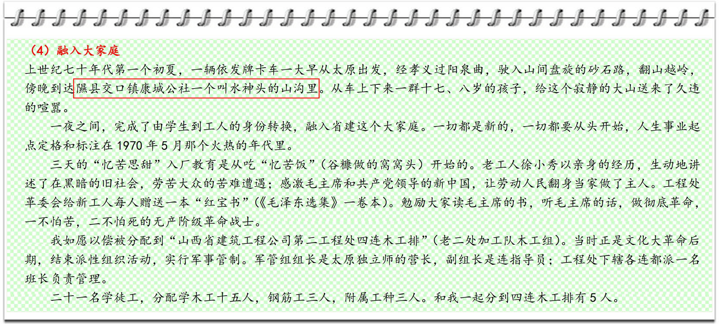 下面衛(wèi)星圖中圈的地方,西北面石槽平因一眼泉水和石槽平而得名,位于山間小道路旁。杏胡和克胡則是兩個(gè)自然村。哪里的村民純樸善良,看到我們進(jìn)村,都站在家門口觀望,大姑娘小媳婦穿著牡丹花被面那種布的衣服,別有一番風(fēng)趣。在城市長大的我,第一次看到這樣的著裝,可謂是聞所未聞!老鄉(xiāng)看到我和同伴抬頭看樹上黃橙橙的杏子,立刻拿一根長長的竹桿,噼里啪啦一陣子打的杏兒啪、啪落了一地,“吃呀!”他說。給人家錢,說什么都不要!一塊錢,核桃100個(gè),雞蛋20個(gè),我倆滿載而歸!水神頭往東北4里,是行政村解家坪,飯店、百貨商店、郵局、理發(fā)店一應(yīng)俱全。這是我和師傅、師弟,星期天經(jīng)常光顧的地方,吃頓飯,買些日用品,少不了提個(gè)生豬頭回來,那是上海楊老師傅的最愛!往正東10里地的康城鎮(zhèn),那是回太原的必經(jīng)之路,少不了在鎮(zhèn)上買一些太原市買不到的汾酒、竹葉青酒,大前門煙,孝敬父親;還有給小外甥女的奶粉和白糖。附帶核桃,雞蛋這些太原的稀罕物。