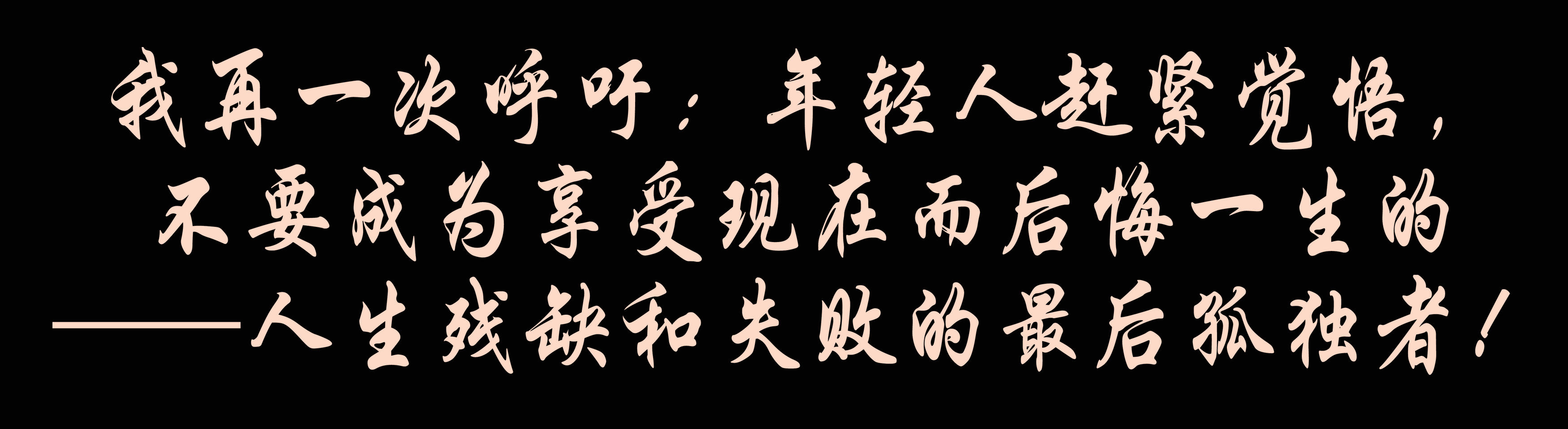 我再一次呼吁:年輕人趕緊覺悟,不要成為享受現(xiàn)在而后悔一生的——人生殘缺和失敗的最后孤獨者!