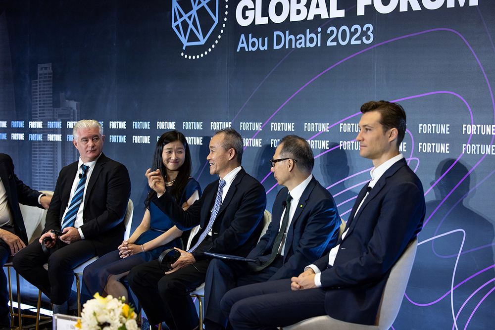 《財(cái)富》全球論壇“展望中國(guó)經(jīng)濟(jì)”圓桌上,五位發(fā)言嘉賓分別是(從左至右):扎耶德大學(xué)政治學(xué)副教授Jonathan Fulton;美國(guó)外交關(guān)系委員會(huì)中國(guó)問題研究員劉宗媛;萬科企業(yè)股份有限公司董事會(huì)名譽(yù)主席王石;德勤中國(guó)首席執(zhí)行官曾順福;和玉資本(MSA Capital)管理合伙人Ben Harburg