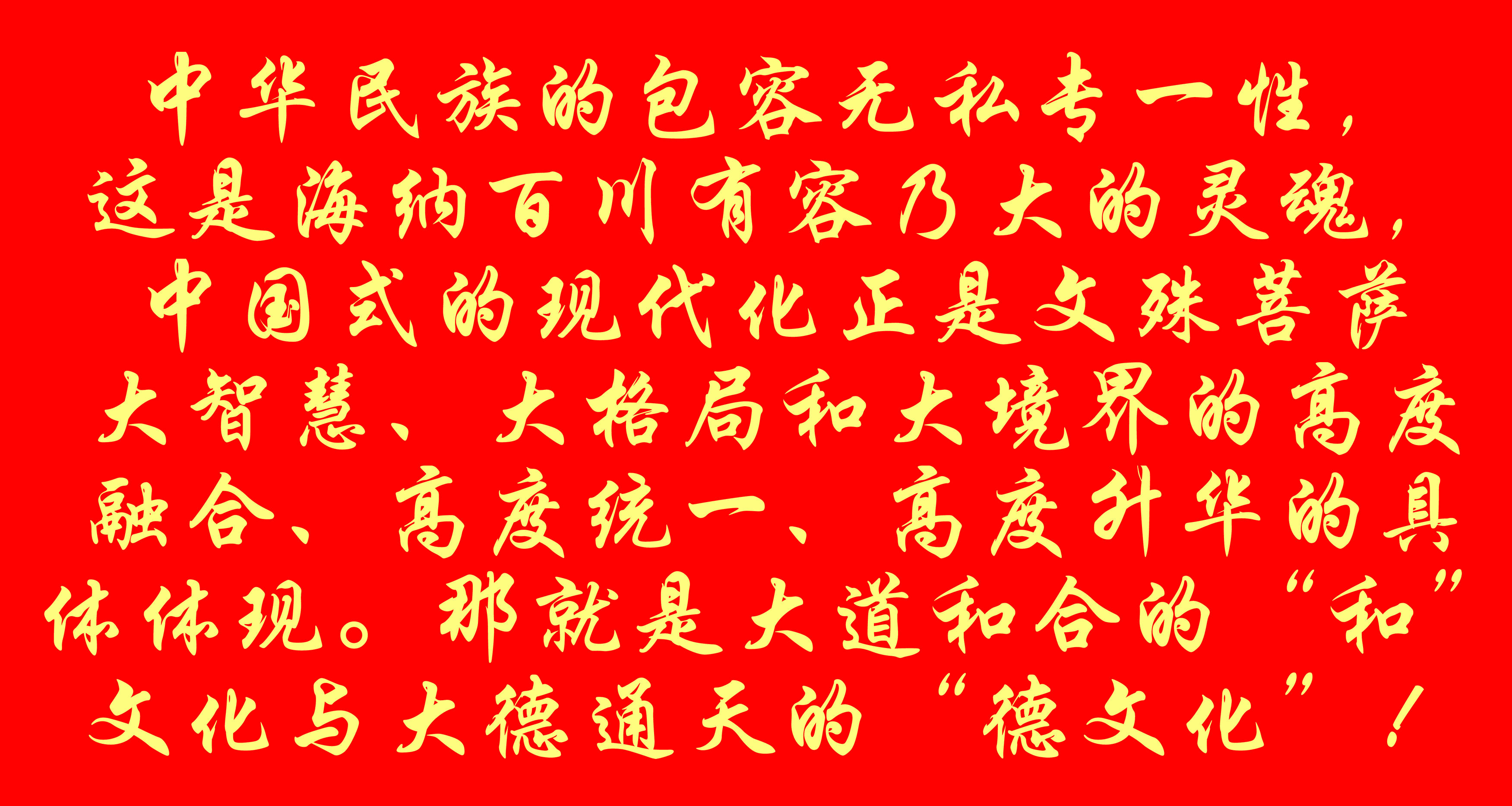 中華民族的包容無私專一性,這是海納百川有容乃大的靈魂,中國式的現(xiàn)代化正是文殊菩薩大智慧、大格局和大境界的高度融合、高度統(tǒng)一、高度升華的具體體現(xiàn)。那就是大道和合的“和”文化與大德通天的“德文化”!