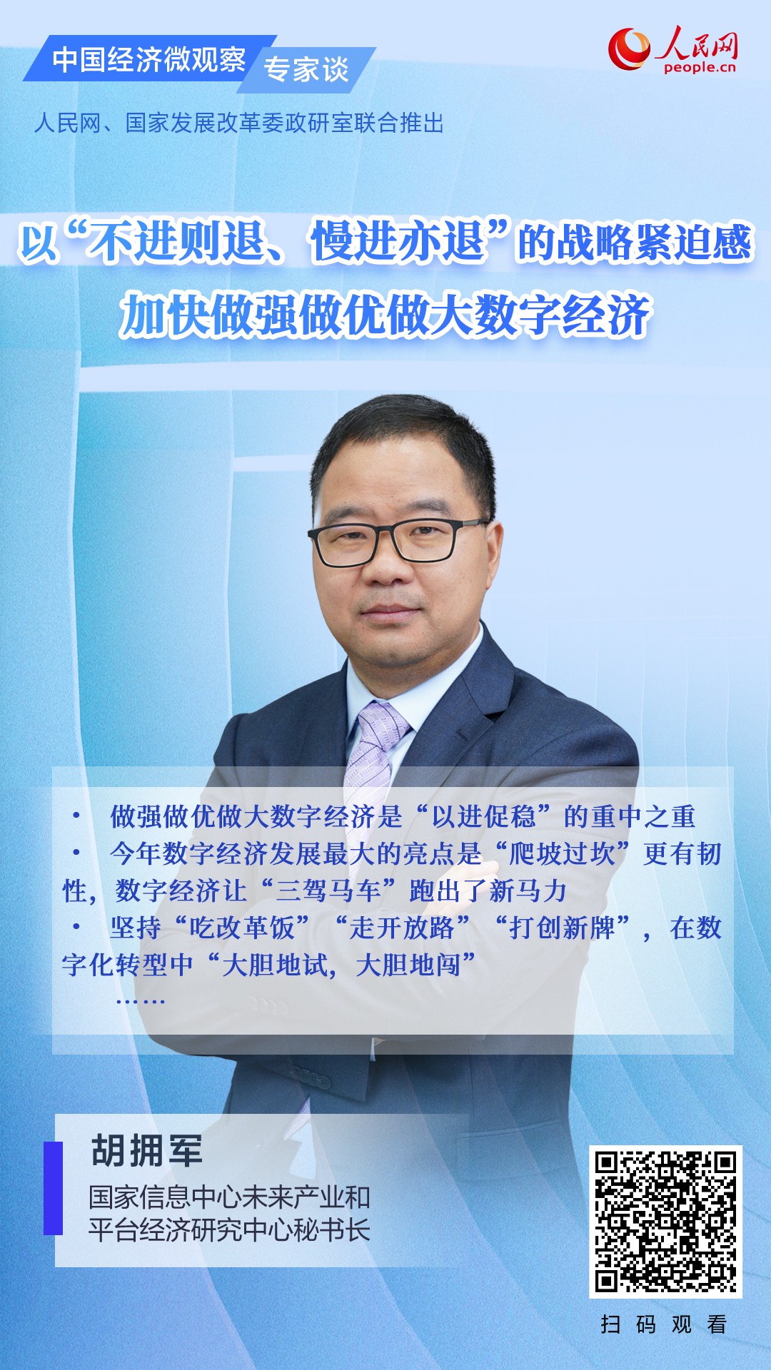 近日,國家信息中心未來產(chǎn)業(yè)和平臺(tái)經(jīng)濟(jì)研究中心秘書長胡擁軍做客《中國經(jīng)濟(jì)微觀察·專家談》欄目時(shí)表示,“以進(jìn)促穩(wěn)”是中央經(jīng)濟(jì)工作會(huì)議釋放的最鮮明的積極信號(hào)之一,從經(jīng)濟(jì)回升向好的趨勢、潛力、基礎(chǔ)來看,做強(qiáng)做優(yōu)做大數(shù)字經(jīng)濟(jì)是“以進(jìn)促穩(wěn)”的重中之重。