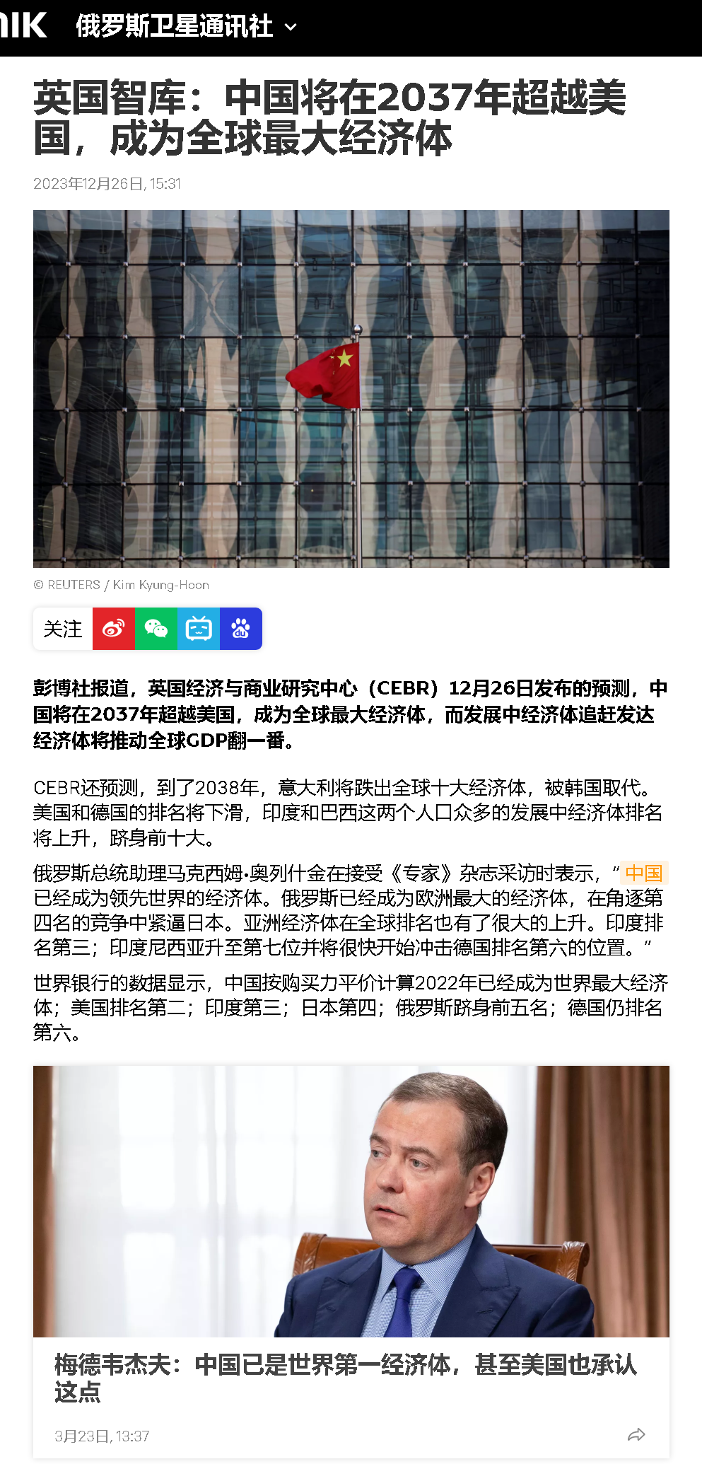 參考消息網(wǎng)12月26日?qǐng)?bào)道 俄羅斯衛(wèi)星社12月26日援引彭博社的報(bào)道稱,根據(jù)英國(guó)經(jīng)濟(jì)與商業(yè)研究中心(CEBR)12月26日發(fā)布的預(yù)測(cè),中國(guó)將在2037年超越美國(guó),成為全球最大經(jīng)濟(jì)體,而發(fā)展中經(jīng)濟(jì)體對(duì)發(fā)達(dá)經(jīng)濟(jì)體的追趕將推動(dòng)全球國(guó)內(nèi)生產(chǎn)總值(GDP)翻一番。