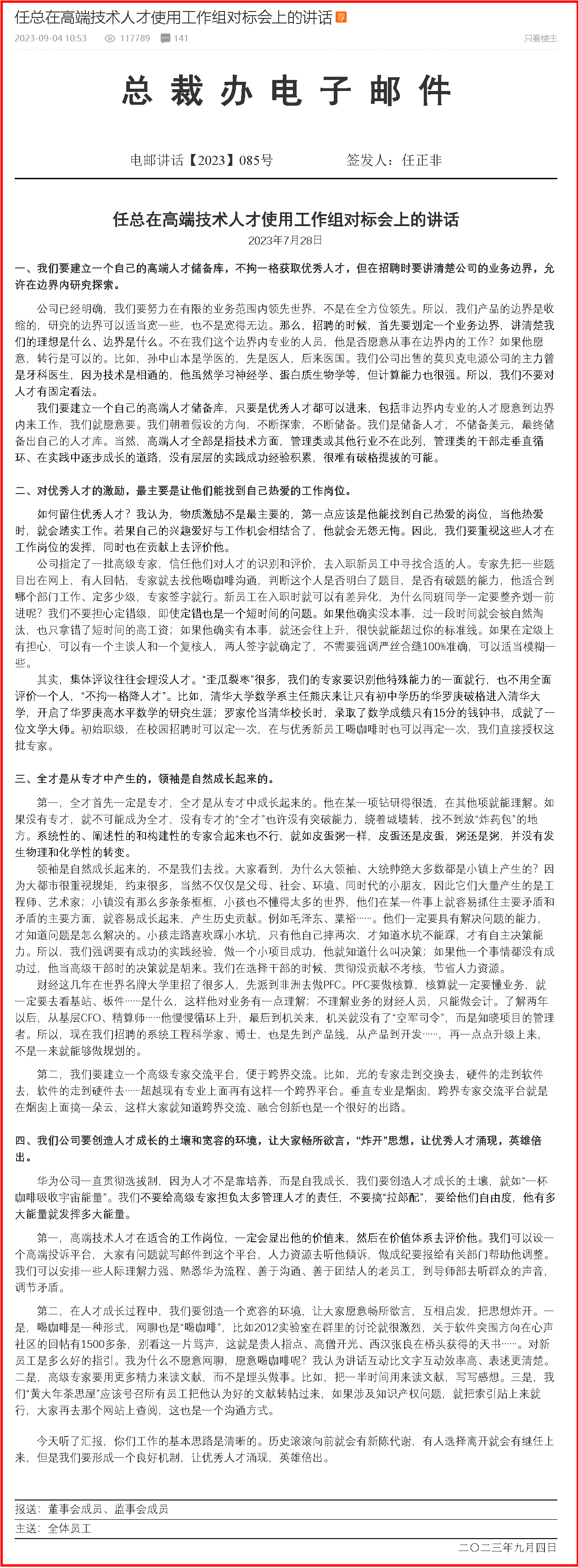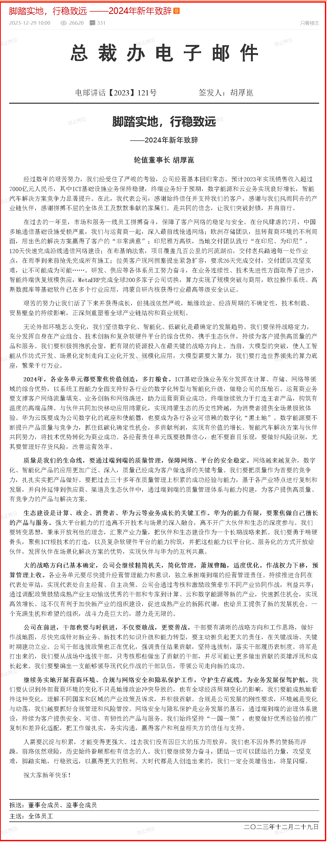 經(jīng)過數(shù)年的艱苦努力,我們經(jīng)受住了嚴(yán)峻的考驗(yàn),公司經(jīng)營基本回歸常態(tài)。預(yù)計(jì)2023年實(shí)現(xiàn)銷售收入超過7000億元人民幣,其中ICT基礎(chǔ)設(shè)施業(yè)務(wù)保持穩(wěn)健,終端業(yè)務(wù)好于預(yù)期,數(shù)字能源和云業(yè)務(wù)實(shí)現(xiàn)良好增長,智能汽車解決方案競爭力顯著提升。在此,我代表公司,感謝始終信任并支持我們的客戶,感謝與我們風(fēng)雨同舟的產(chǎn)業(yè)鏈伙伴,感謝拼搏不屈的全體員工及默默奉獻(xiàn)的家屬們。是共同的信念,讓我們突破封鎖,并肩前行。