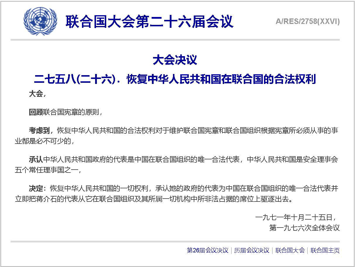 紐約曼哈頓東河之濱,聯(lián)合國總部,當(dāng)?shù)貢r間1971年10月25日晚,這是一個載入新中國外交史冊的重要時刻。76票贊成、35票反對、17票棄權(quán),第二十六屆聯(lián)合國大會以壓倒性多數(shù)通過2758號決議,恢復(fù)中華人民共和國在聯(lián)合國的一切合法權(quán)利,并立即把臺灣國民黨當(dāng)局的代表從聯(lián)合國的一切機(jī)構(gòu)中驅(qū)逐出去。習(xí)近平總書記深刻指出:“1971年,中國恢復(fù)在聯(lián)合國的合法席位、重返日內(nèi)瓦國際機(jī)構(gòu)后,逐步參與裁軍、經(jīng)貿(mào)、人權(quán)、社會等各領(lǐng)域事務(wù),為重大問題解決和重要規(guī)則制定提供了中國方案。”