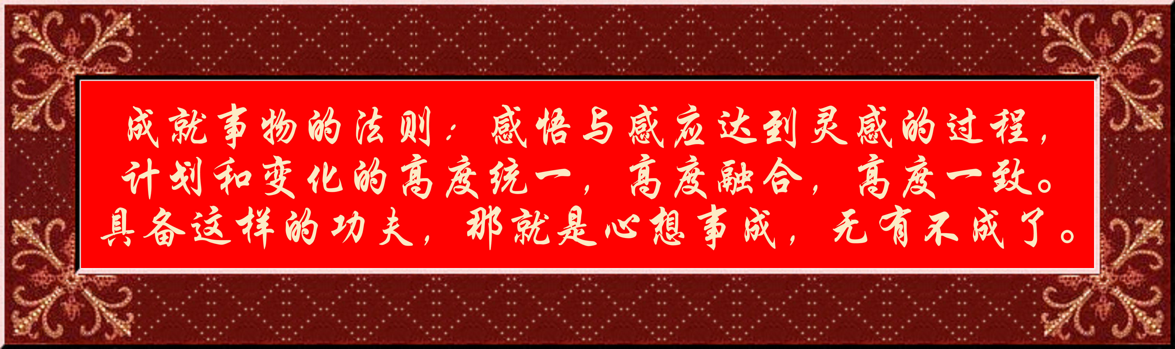 什么時候做什么事,幾月幾日,哪個季節(jié),時間地點,分秒不差。這就是成就事物的法則:感悟與感應(yīng)達(dá)到靈感的過程,計劃和變化的高度統(tǒng)一,高度融合,高度一致。具備這樣的功夫,那就是心想事成,無有不成了。