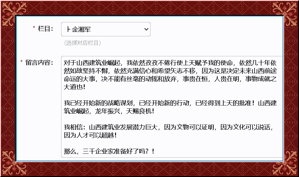 對于山西建筑業(yè)崛起,我依然孜孜不倦行使上天賦予我的使命,依然幾十年依然如故堅持不懈,依然充滿信心和希望矢志不移,因為這是決定未來山西前途命運的大事,決不能有絲毫的動搖和放棄,事貴在恒,人貴在明,事物成就之大道也!