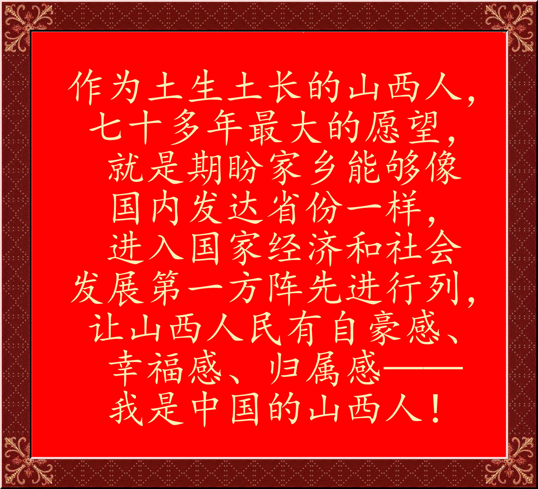 作為土生土長的山西人,七十多年最大的愿望,就是期盼家鄉(xiāng)能夠像國內(nèi)發(fā)達(dá)省份一樣,進(jìn)入國家經(jīng)濟和社會發(fā)展第一方陣先進(jìn)行列,讓山西人民有自豪感、幸福感、歸屬感——我是中國的山西人!