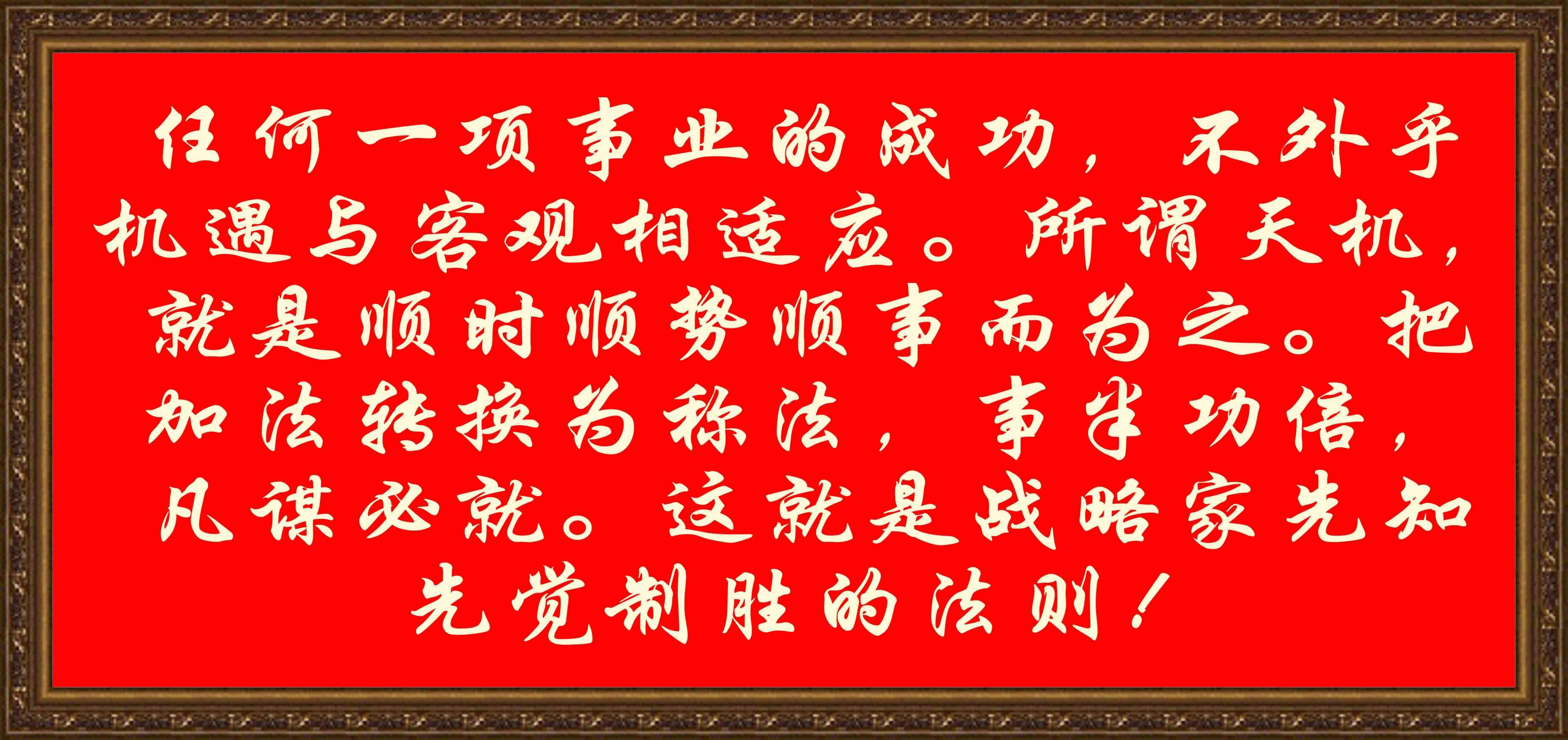 任何一項事業(yè)的成功,不外乎機(jī)遇與客觀相適應(yīng)。所謂天機(jī),就是順時順勢順事而為之。把加法轉(zhuǎn)換為稱法,事半功倍,凡謀必就。這就是戰(zhàn)略家先知先覺制勝的法則!