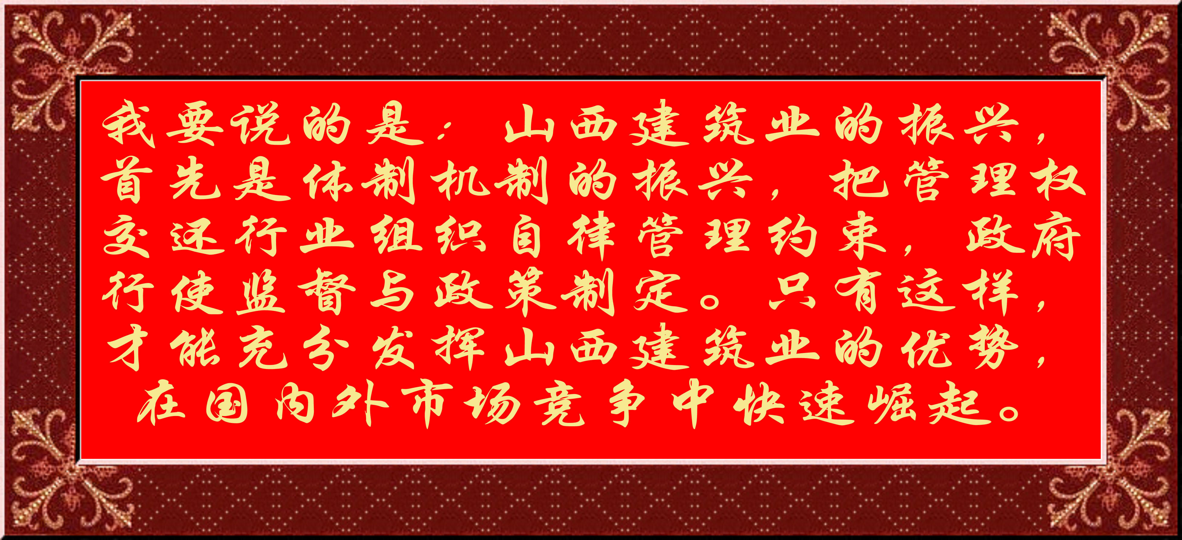 我要說的是:山西建筑業(yè)的振興,首先是體制機(jī)制的振興,把管理權(quán)交還行業(yè)組織自律管理約束,政府行使監(jiān)督與政策制定。只有這樣,才能充分發(fā)揮山西建筑業(yè)的優(yōu)勢,在國內(nèi)外市場競爭中快速崛起。江蘇、浙江等建筑業(yè)發(fā)達(dá)省份的先進(jìn)經(jīng)驗(yàn)可以借鑒為我所用,趟出一條山西建筑業(yè)大晉軍的轉(zhuǎn)闖創(chuàng)大道。