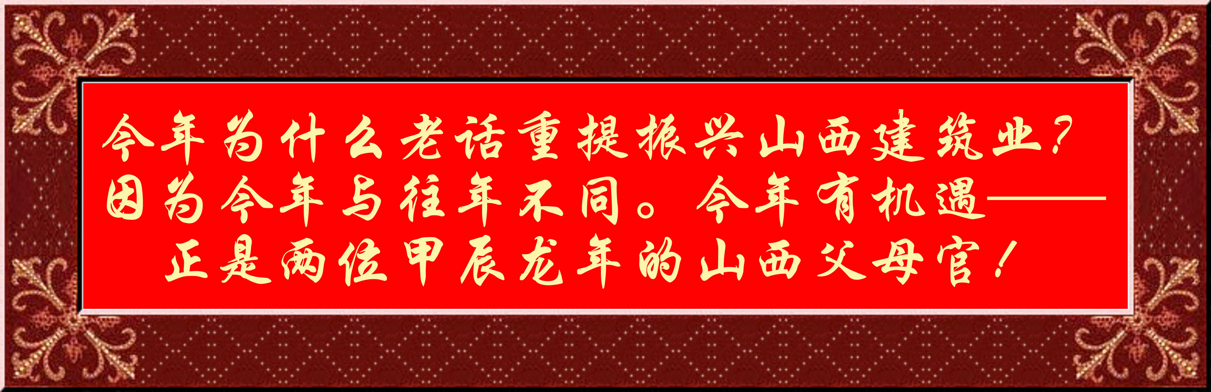 多少年來(lái),我的最大愿望、期望、希望、盼望、想望,就是把山西建筑業(yè)做為事業(yè)做大做強(qiáng),成為山西經(jīng)濟(jì)和社會(huì)發(fā)展的支柱大產(chǎn)業(yè),成為興晉富民功在當(dāng)代利在長(zhǎng)遠(yuǎn)造福子孫的大行業(yè),成為成就一代又一代大企業(yè)、大集團(tuán)、大公司大企業(yè)家的發(fā)祥地!五望五謀五大略,今年為什么老話重提振興山西建筑業(yè)?因?yàn)榻衲昱c往年不同。今年有機(jī)遇——正是兩位甲辰龍年的山西父母官!