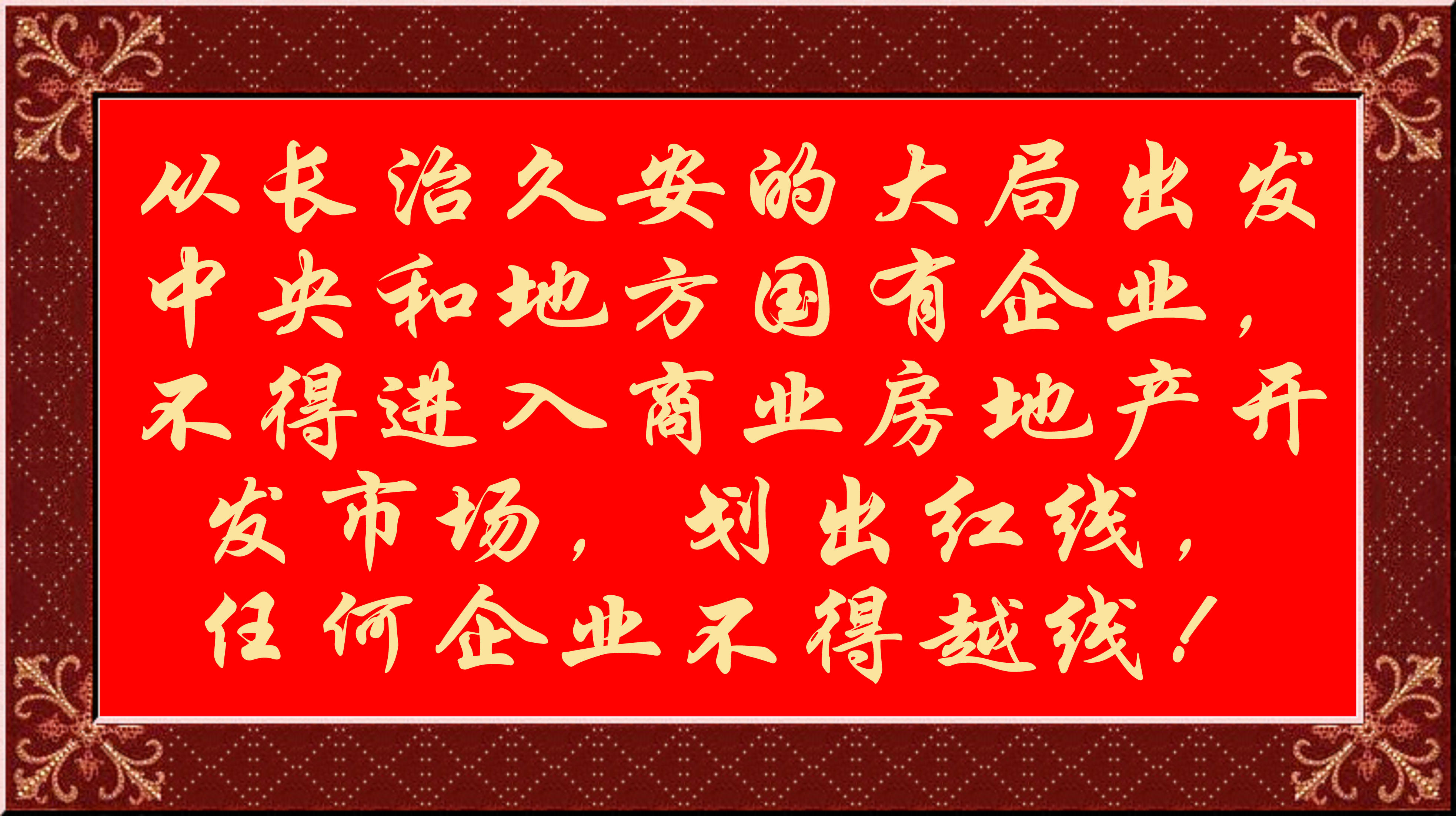 感應(yīng)房地產(chǎn)業(yè)回歸正常發(fā)展渠道,安居樂業(yè)是國家穩(wěn)固永恒的使命,應(yīng)該從長治久安的大局出發(fā),嚴(yán)格房地產(chǎn)業(yè)宏觀管理,中央和地方國有企業(yè),不得進(jìn)入商業(yè)房地產(chǎn)開發(fā)市場,劃出紅線,任何企業(yè)不得越線!