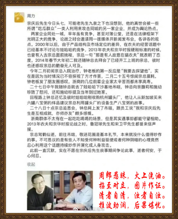 同行是冤家,一山難容二虎,這兩句老話人人皆知卻又人人不懂,其中的根源還是一個(gè)利益的糾葛和矛盾, 鐘睒睒顯然不具備大智慧的格局和境界!而他的同僚意氣用事更把事情復(fù)雜化,直接加劇了矛盾進(jìn)一步激化,形成了一種文化和理念上的沖突在所難免!因?yàn)橐呀?jīng)上升到社會(huì)現(xiàn)象的局面,任何一方都無法控制和左右事態(tài)發(fā)展的節(jié)奏和后果了!