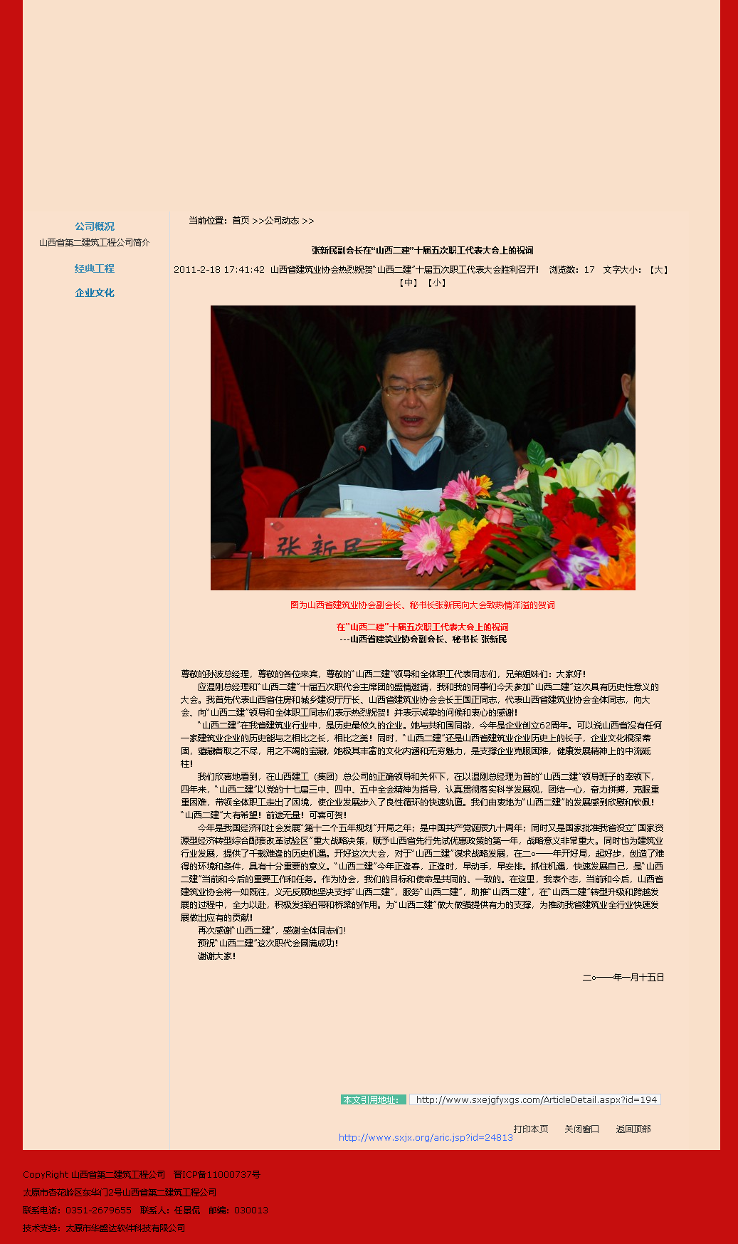 今天之所以把山西二建集團(tuán)有限公司的奠基人和他的事跡發(fā)布,就是要在恰當(dāng)?shù)臅r(shí)間和空間交匯點(diǎn),金龍?zhí)ь^騰飛時(shí)刻,把山西二建再一次推上一個(gè)嶄新的發(fā)展階段——造就一個(gè)英雄的、光榮的、強(qiáng)大的百年山西二建!