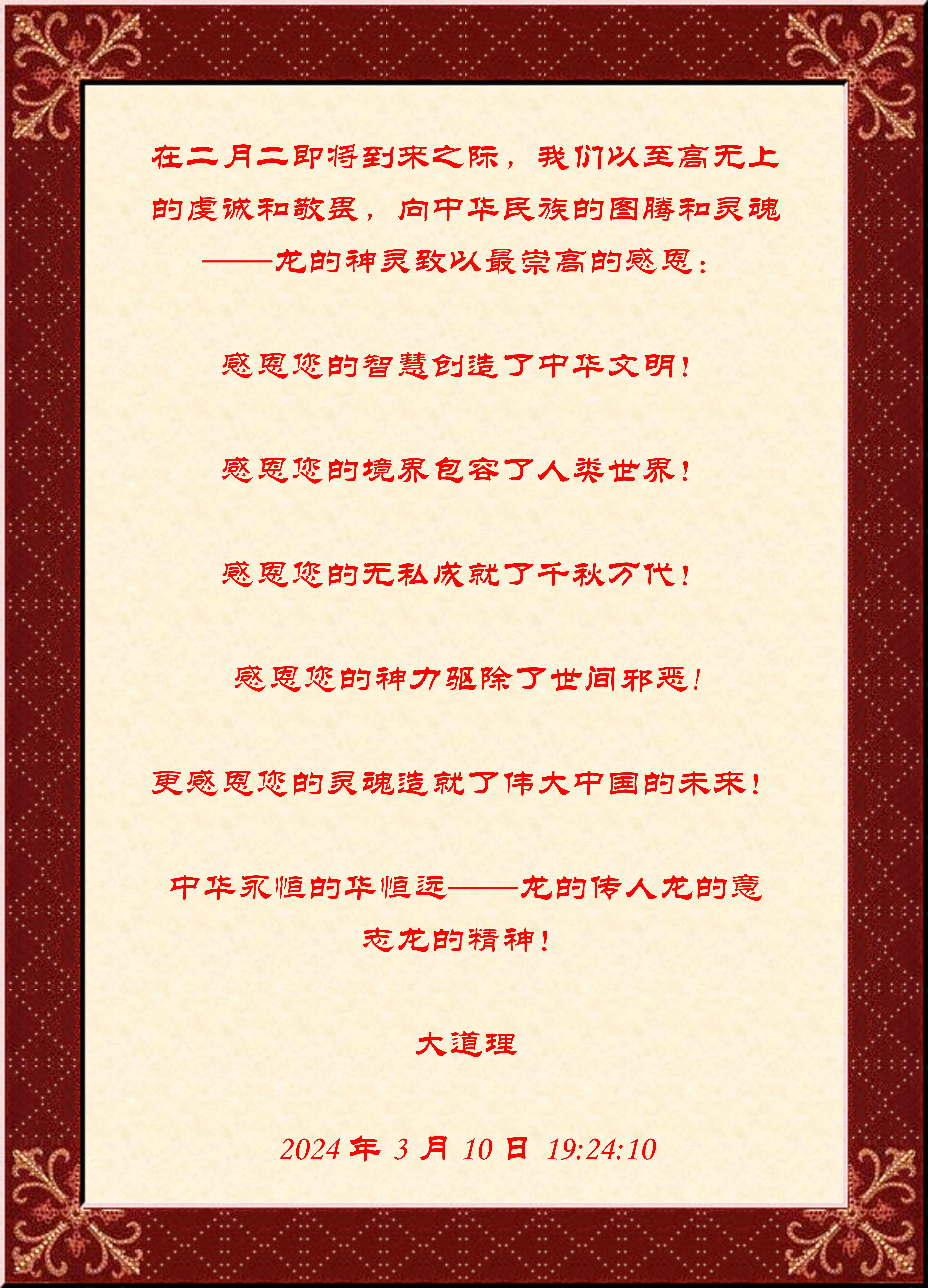 在二月二即將到來(lái)之際,我們以至高無(wú)上的虔誠(chéng)和敬畏,向中華民族的圖騰和靈魂——龍的神靈致以最崇高的感恩: