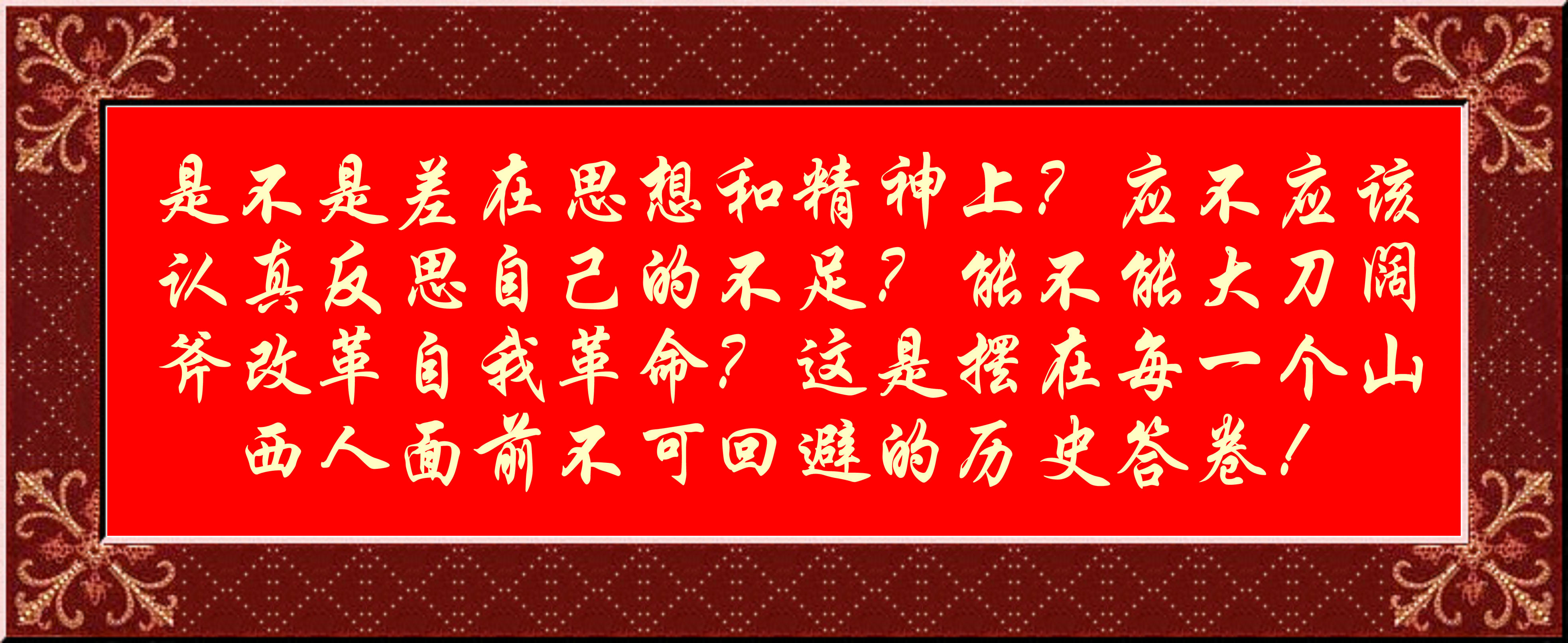 是不是差在思想和精神上?應(yīng)不應(yīng)該認(rèn)真反思自己的不足?能不能大刀闊斧改革自我革命?這是擺在每一個(gè)山西人面前不可回避的歷史答卷!