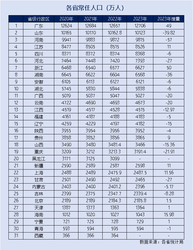2023年數(shù)據(jù)顯示,常住人口增長的省市區(qū)主要出現(xiàn)在南方,特別是東南沿海省份。
