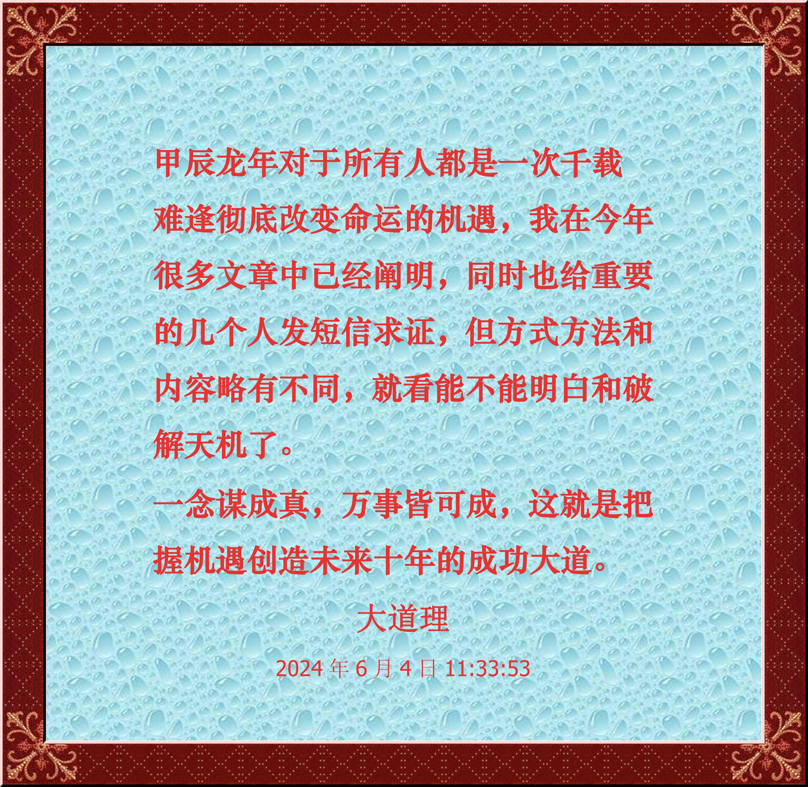 甲辰龍年對于所有人都是一次千載難逢徹底改變命運的機遇,我在今年很多文章中已經(jīng)闡明,同時也給重要的幾個人發(fā)短信求證,但方式方法和內容略有不同,就看能不能明白和破解天機了。