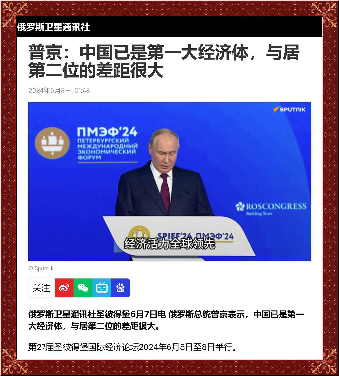 【學習園地】普京:中國已是第一大經(jīng)濟體,與居第二位的差距很大