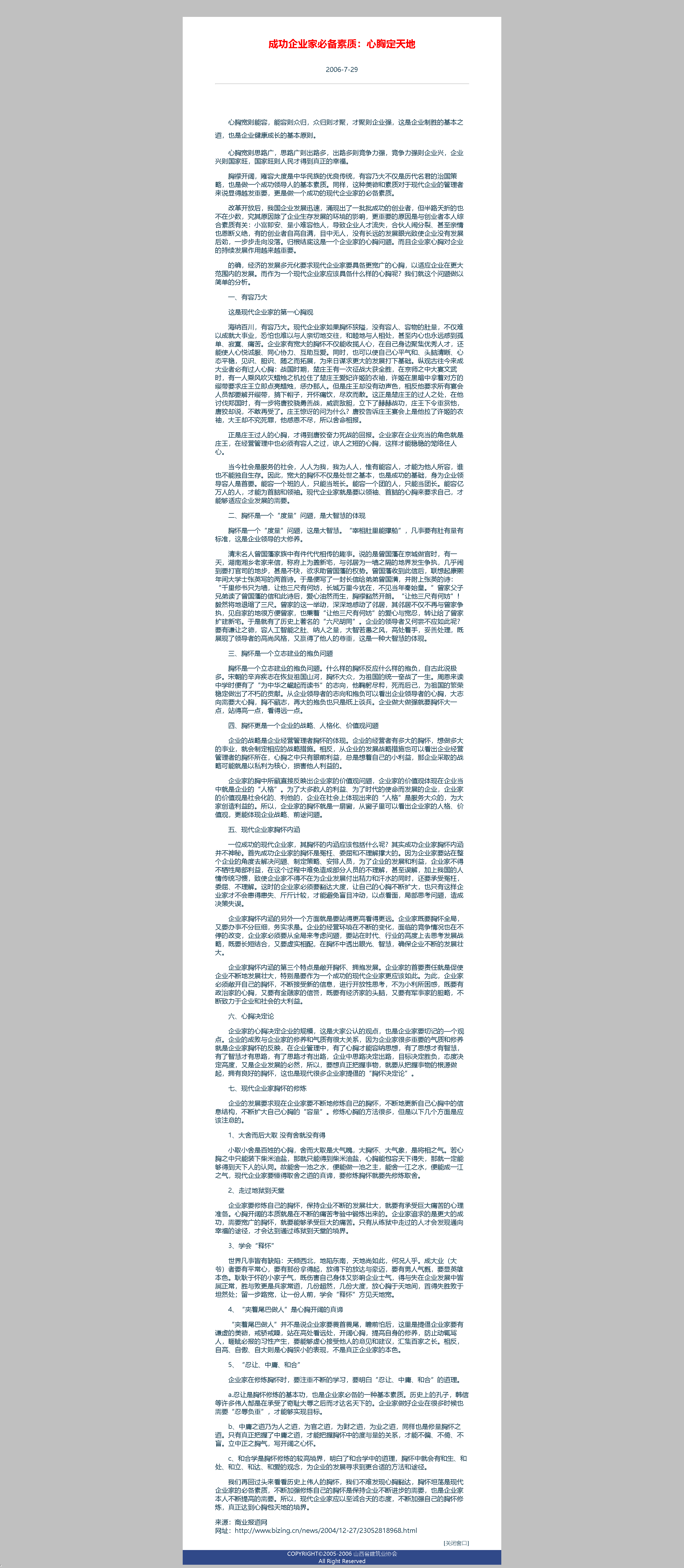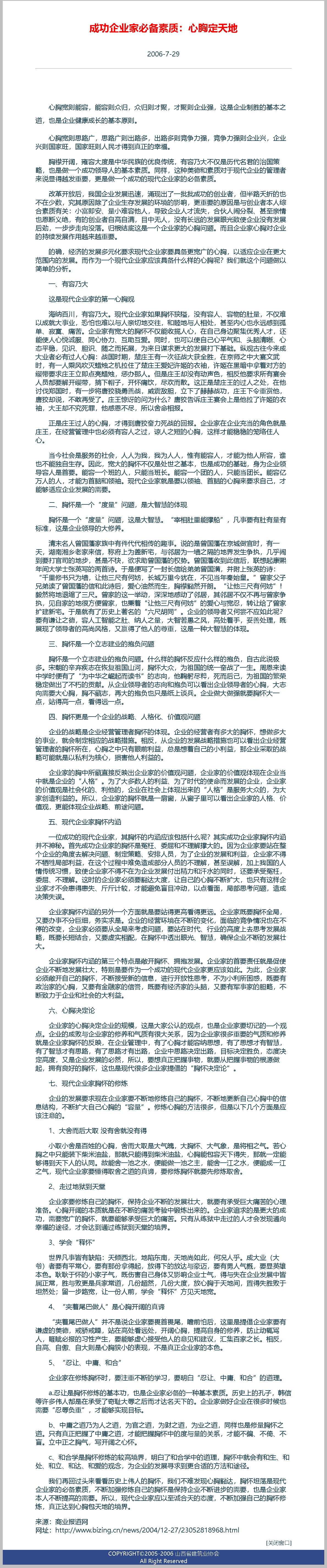 我們?cè)倩剡^(guò)頭來(lái)看看歷史上偉人的胸懷,我們不難發(fā)現(xiàn)心胸豁達(dá),胸懷坦蕩是現(xiàn)代企業(yè)家的必備素質(zhì),不斷加強(qiáng)修煉自己的胸懷是保持企業(yè)不斷進(jìn)步的需要,也是企業(yè)家本人不斷提高的需要。所以,現(xiàn)代企業(yè)家應(yīng)以至誠(chéng)合天的態(tài)度,不斷加強(qiáng)自己的胸懷修煉,真正達(dá)到心胸包天地的境界。