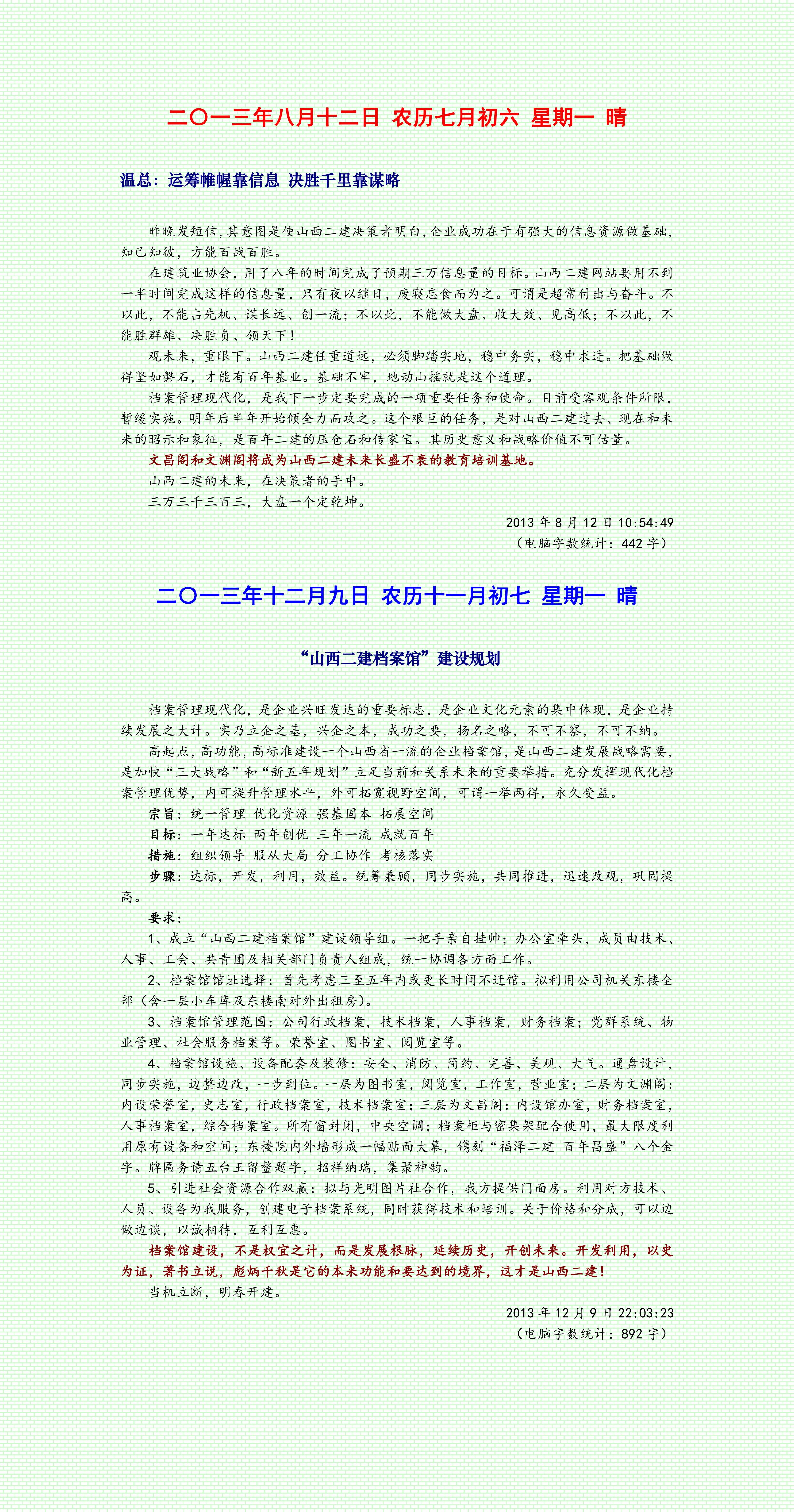 明年搞檔案館建設(shè)和檔案管理現(xiàn)代化,三年創(chuàng)一流是有把握的。今年耽誤的時(shí)間要找回來(lái),還要比去年計(jì)劃提前一年實(shí)現(xiàn),就是到2016年底,山西二建一定成為山西省乃至全國(guó)建筑行業(yè)一流的現(xiàn)代化檔案館。這一點(diǎn),我有信心。我清楚自己的使命,三年做成一件事,2017年開(kāi)始,要做第三件事,就是為山西二建歷史著書(shū)立說(shuō),讓世人和我們的后代知道并且明白,責(zé)任和使命對(duì)于山西二建意味著什么?客觀與現(xiàn)實(shí)、公平與正義代表著什么?榮譽(yù)和尊嚴(yán)對(duì)于山西二建是多么的來(lái)之不易和異常珍貴!當(dāng)然,這只是我的一廂情愿,公司未來(lái)有沒(méi)有像溫總一樣英明的決策者,值不值得我繼續(xù)理想和目標(biāo),要看山西二建的氣數(shù)和周期了。應(yīng)該和實(shí)際,其實(shí)往往是一念之差,要看是什么人,什么事,什么空間,什么維度了。