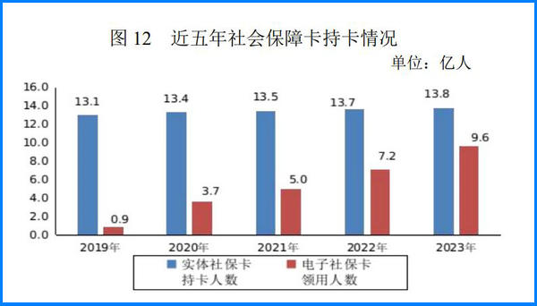 年末全國(guó)社會(huì)保障卡持卡人數(shù)達(dá)13.79億人,覆蓋97.7%人口;領(lǐng)用電子社會(huì)保障卡人數(shù)達(dá)9.62億人,全年提供線(xiàn)上服務(wù)151億人次。全國(guó)人社政務(wù)服務(wù)平臺(tái)全年訪問(wèn)量11.18億人次。