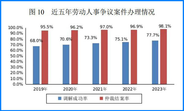 全年全國(guó)各級(jí)勞動(dòng)人事?tīng)?zhēng)議調(diào)解組織和仲裁機(jī)構(gòu)共辦理勞動(dòng)人事?tīng)?zhēng)議案件 385.0 萬(wàn)件,涉及勞動(dòng)者 408.2 萬(wàn)人。全年辦結(jié)爭(zhēng)議案件 373.4 萬(wàn)件,結(jié)案金額 829.9 億元。全年勞動(dòng)人事?tīng)?zhēng)議調(diào)解成功率 77.7%,仲裁結(jié)案率 98.1%,仲裁終結(jié)率72.3%。