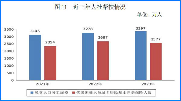 2023 年脫貧人口務(wù)工規(guī)模達(dá)到 3397 萬(wàn)人。全國(guó)組織農(nóng)民工參加補(bǔ)貼性職業(yè)技能培訓(xùn) 643 萬(wàn)人次。國(guó)家鄉(xiāng)村振興重點(diǎn)幫扶地區(qū)職業(yè)技能提升工程完成時(shí)序目標(biāo)任務(wù)。全年共為 2577萬(wàn)困難人員代繳城鄉(xiāng)居民基本養(yǎng)老保險(xiǎn)費(fèi),困難人員參保率保持在 99%以上。選派 2.1 萬(wàn)名高校畢業(yè)生到基層從事支農(nóng)和幫扶鄉(xiāng)村振興服務(wù)。